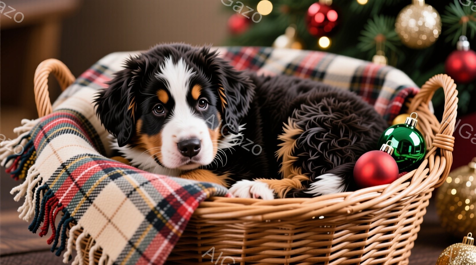 バスケットの中に、毛並みの美しいベルニース・マウンテン・ドッグの子犬が、チェック柄のブランケットに寄りかかって眠っている様子が描かれています。子犬はリラックスした表情で、周囲にはクリスマスオーナメントが散りばめられ、温かく穏やかな雰囲気を醸し出しています。背景には緑のクリスマスツリーがぼんやりと見え、クリスマスの季節感を強調しています。