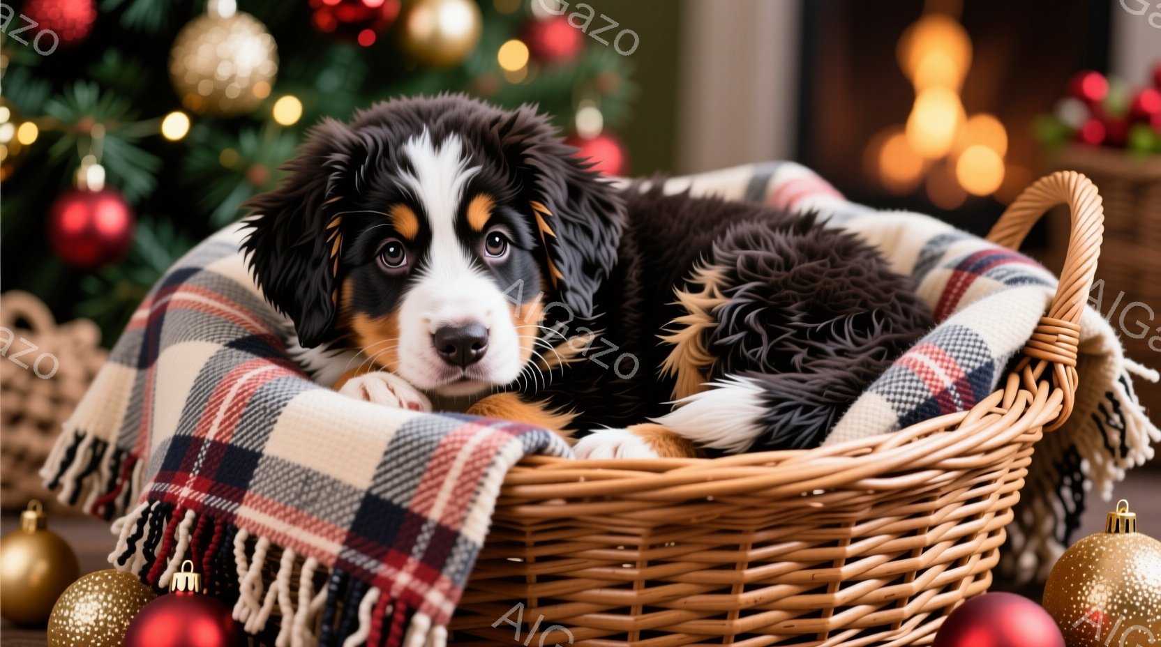 籠の中に、ふわふわとした毛並みのバーニーズマウンテン・ドッグの子犬が丸まって眠っている。赤と白のチェック柄のブランケットが籠の中に敷かれており、子犬の周りにはクリスマスオーナメントが散りばめられている。暖かく、居心地の良い、お祝いの雰囲気が漂う、冬の光景である。