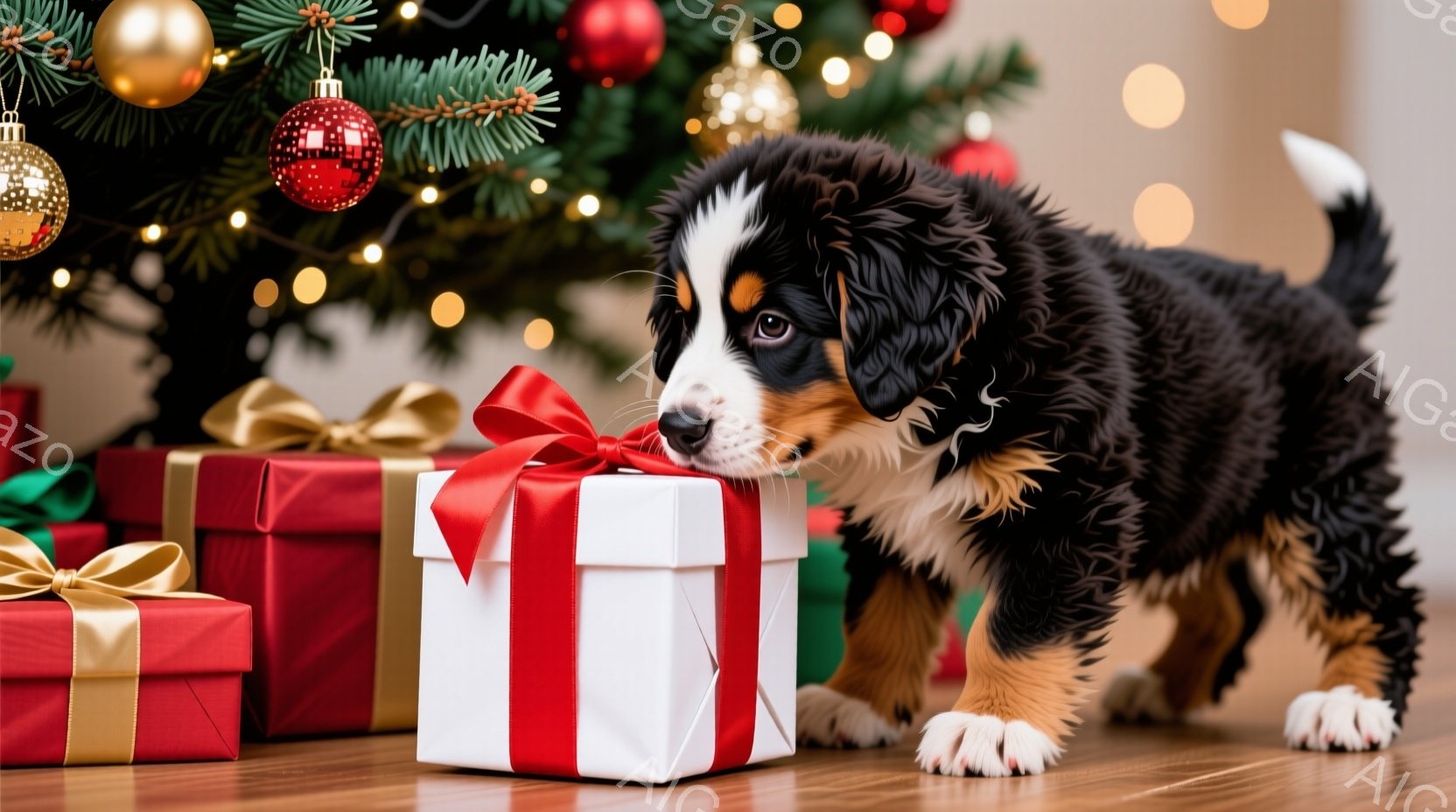 雪が降り積もる窓辺に、黒と白の毛並みの大型犬が座っています。犬は外の雪景色を穏やかな表情で見つめ、赤い首輪がアクセントになっています。背景にはきらびやかなクリスマスツリーが飾られ、暖かく優しい冬の雰囲気を醸し出しています。