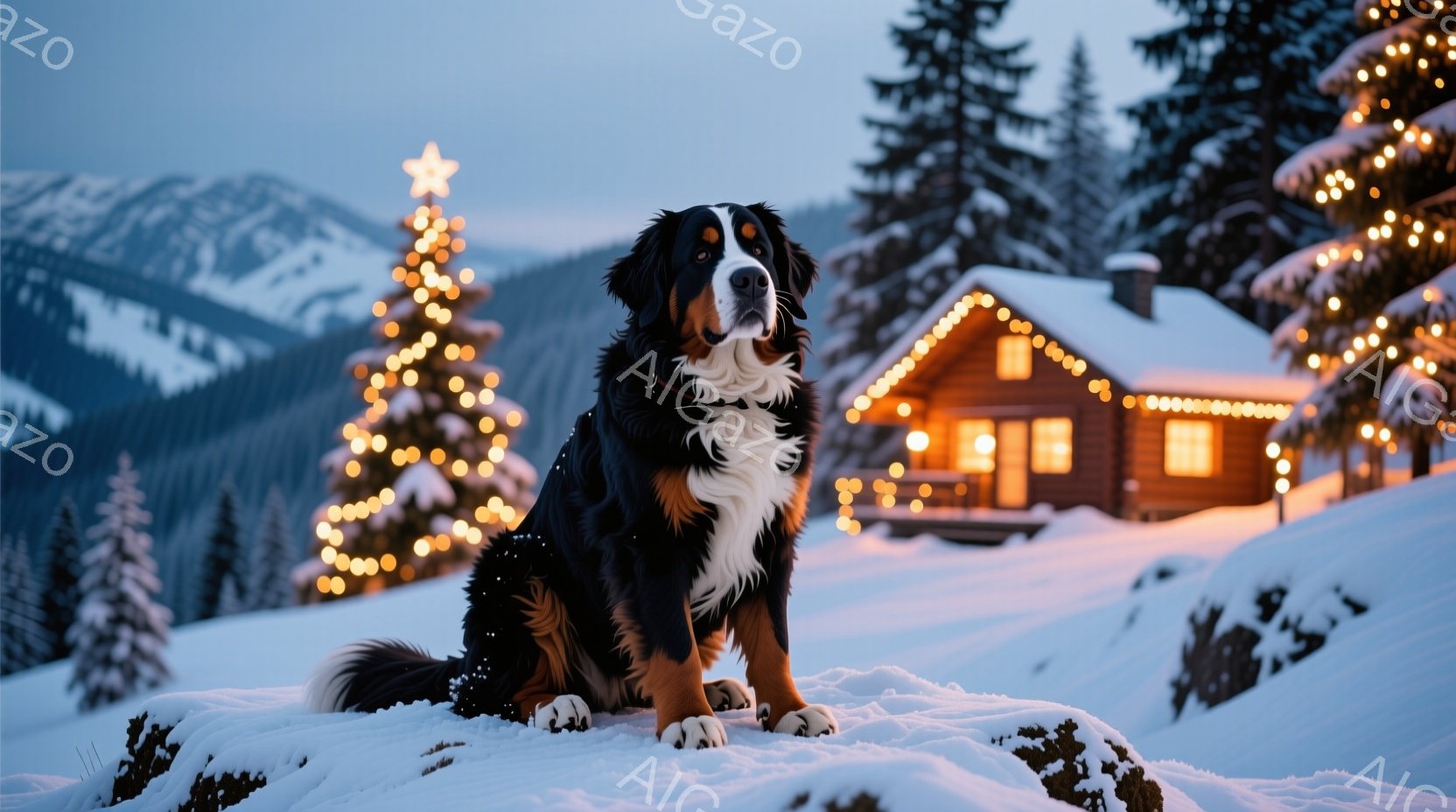 雪景色の中に、白黒模様の大型犬が座っています。背景にはクリスマスツリーのように飾り付けられた木々と、暖かく光るログハウスが見え、冬の温かい雰囲気を醸し出しています。雪が降り積もった丘の上で、犬は前方をまっすぐ見つめ、静かで穏やかな様子です。