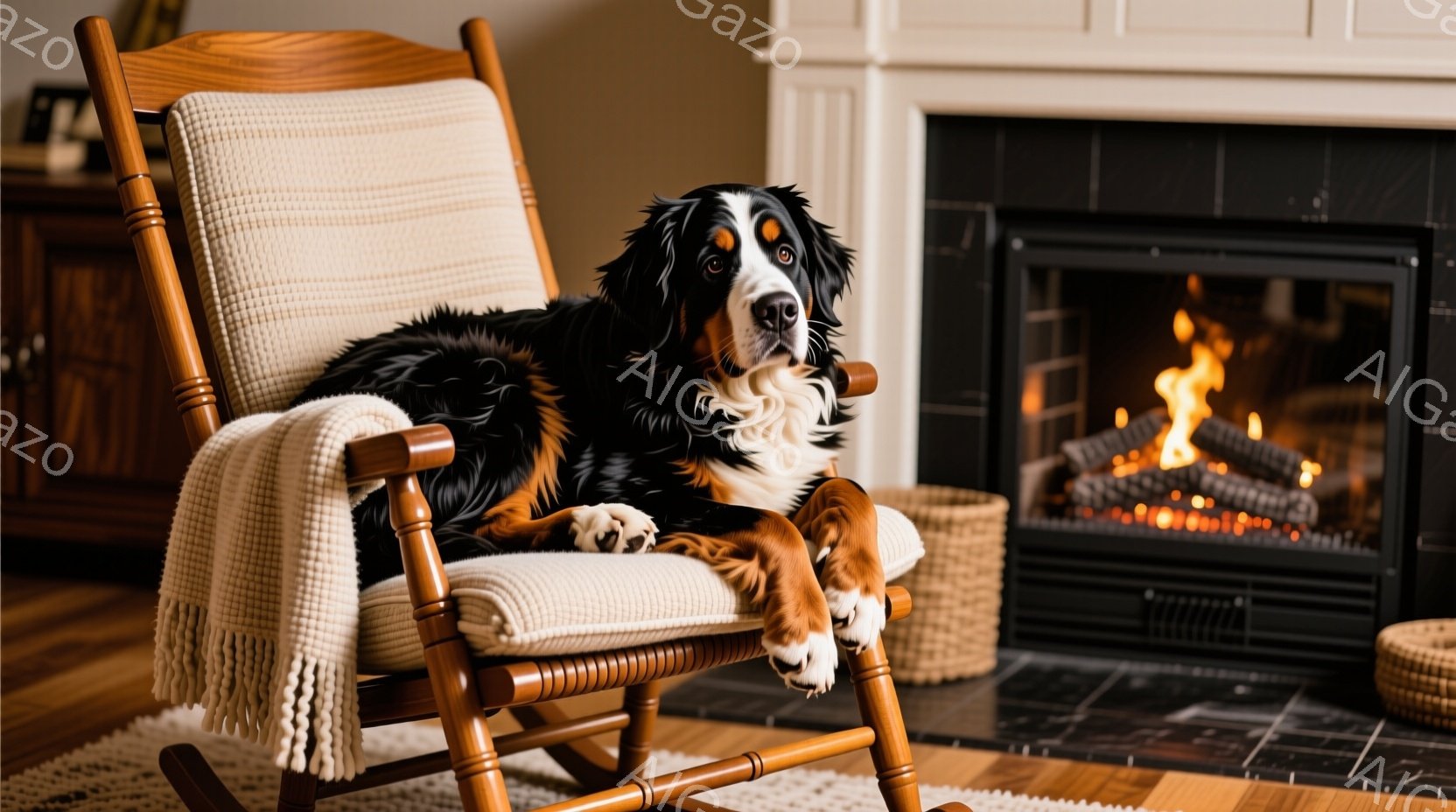 暖炉の前に置かれた揺り椅子に、ベルン山犬がゆったりと横たわっている。犬は白いあごと胸、黒と茶色の毛並みで、リラックスした表情でこちらを見ている。背景には暖炉があり、炎が燃え盛っているのが見える。