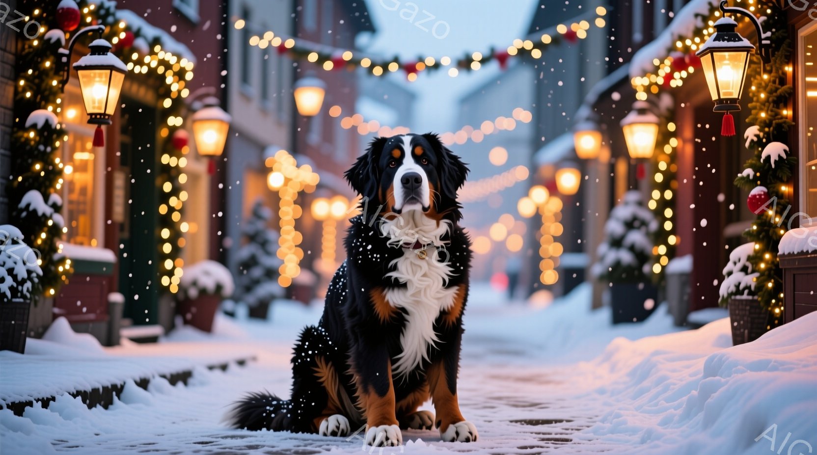 雪に覆われた石畳の道に、ベルン山犬が座っています。犬は黒、白、茶色の毛並みで、穏やかな表情を浮かべて正面を見ています。背景には、クリスマスイルミネーションで飾られた建物が並び、雪が舞い散る冬の夜の穏やかな雰囲気を醸し出しています。