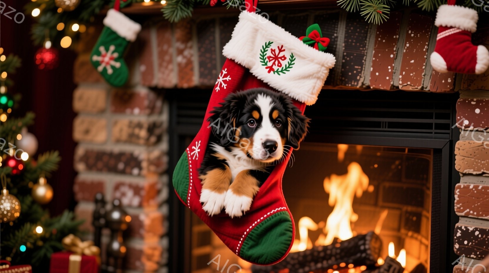 赤いクリスマスストッキングの中に、小さなバーニーズ・マウンテン・ドッグの子犬が可愛らしく顔を出しています。子犬は少し不安そうですが、好奇心旺盛な表情でこちらを見ており、ストッキングの縁に顔と前足を覗かせています。背景には暖炉があり、炎が燃え盛り、クリスマスツリーと飾り付けが見え、全体的に暖かく、居心地の良いホリデーシーズンを思わせる雰囲気です。
