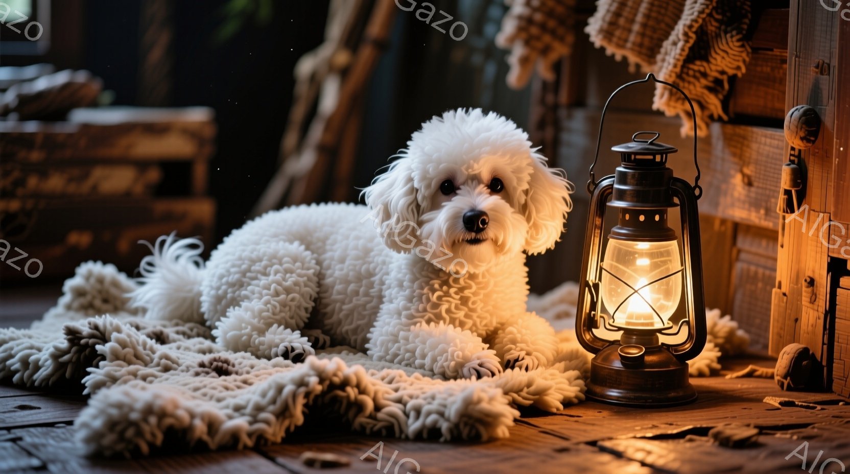 白い巻き毛の犬が、茶色の手編みのマットの上に横たわっています。背後にはアンティーク調のランタンが灯り、暖かく落ち着いた雰囲気を醸し出しています。背景には、ぼんやりとした家具や装飾が見え、レトロで心地よい空間を演出しています。