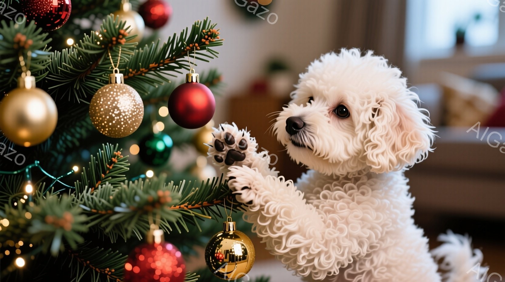 白い巻き毛の犬が、ふわふわの白いラグの上に横たわっています。傍らには、暖かく光るオイルランプが置かれ、暗い背景に温かい光を投げかけています。全体的に、リラックスした、心地よい、冬の雰囲気を醸し出しています。