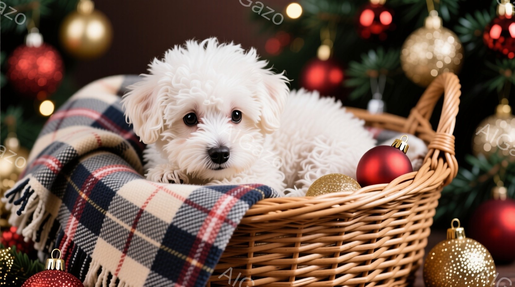白いふわふわの犬が、赤と黒のチェック柄の毛布が敷かれた籐のバスケットに丸まって眠っています。背景には、金色のオーナメントと赤いクリスマスボールが飾られたクリスマスツリーがぼやけて見え、暖かく穏やかなクリスマスの雰囲気を醸し出しています。犬はリラックスした表情で、バスケットの中で安らかに眠っている様子が伝わってきます。