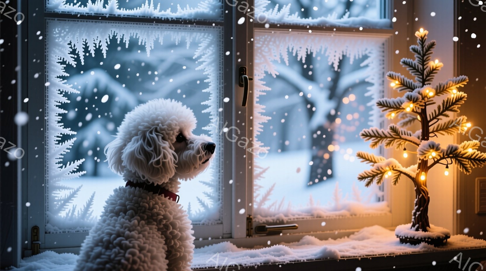 白い巻き毛の犬が窓から雪景色を眺めている。窓枠は霜で覆われ、外では木々が雪に覆われた冬の風景が広がっている。暖かく穏やかな雰囲気が漂い、犬は静かに雪景色を楽しんでいるようだ。