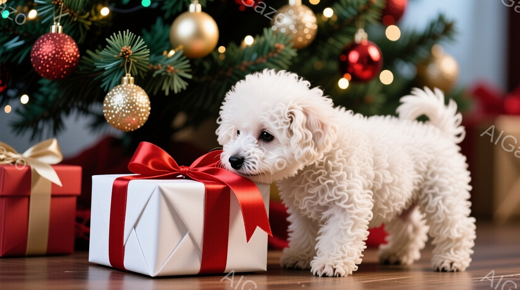 白い巻き毛の犬が窓辺に立ち、外の雪景色を眺めている。窓枠には雪が積もり、庭や木々は雪に覆われている。暖炉のような光を放つ小さなクリスマスツリーが犬の隣にあり、暖かい雰囲気を醸し出している。