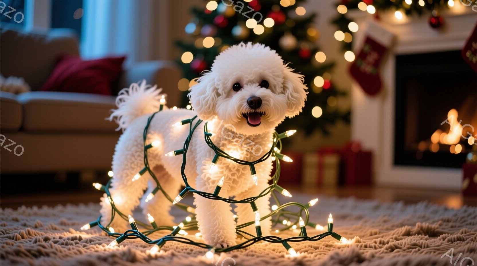 白い巻き毛の犬が、クリスマスのイルミネーションライトに絡まれて座っています。犬は口を開けて楽しそうに微笑んでおり、その姿は遊び心に満ちています。背景には、クリスマスツリーや暖炉が見え、室内全体が温かく、祝祭的な雰囲気に包まれています。