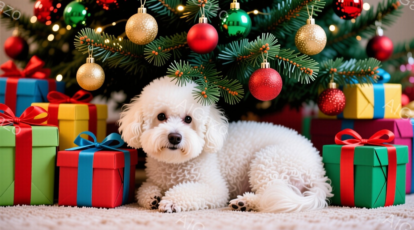 白い巻き毛の犬が赤い敷物の上に座っており、周囲にはカラフルなリボンで飾られたプレゼントの箱が並んでいます。クリスマスツリーが背景にあり、様々な色のオーナメントで飾られています。犬は正面を見つめており、穏やかで可愛らしい雰囲気を醸し出しています。