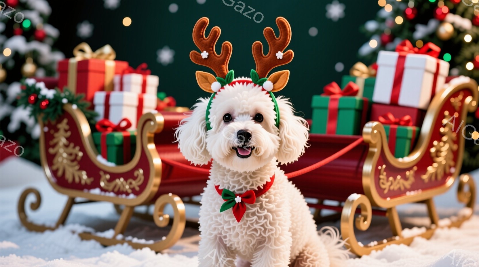 白い巻き毛の犬が、赤いトナカイの角飾りをつけて雪の上に立っています。背景には、プレゼントが積み上げられたそりや、飾られたクリスマスツリーが見え、キラキラと輝く雪が舞っています。犬は口を開けて笑顔で、陽気で温かいクリスマスの雰囲気を醸し出しています。