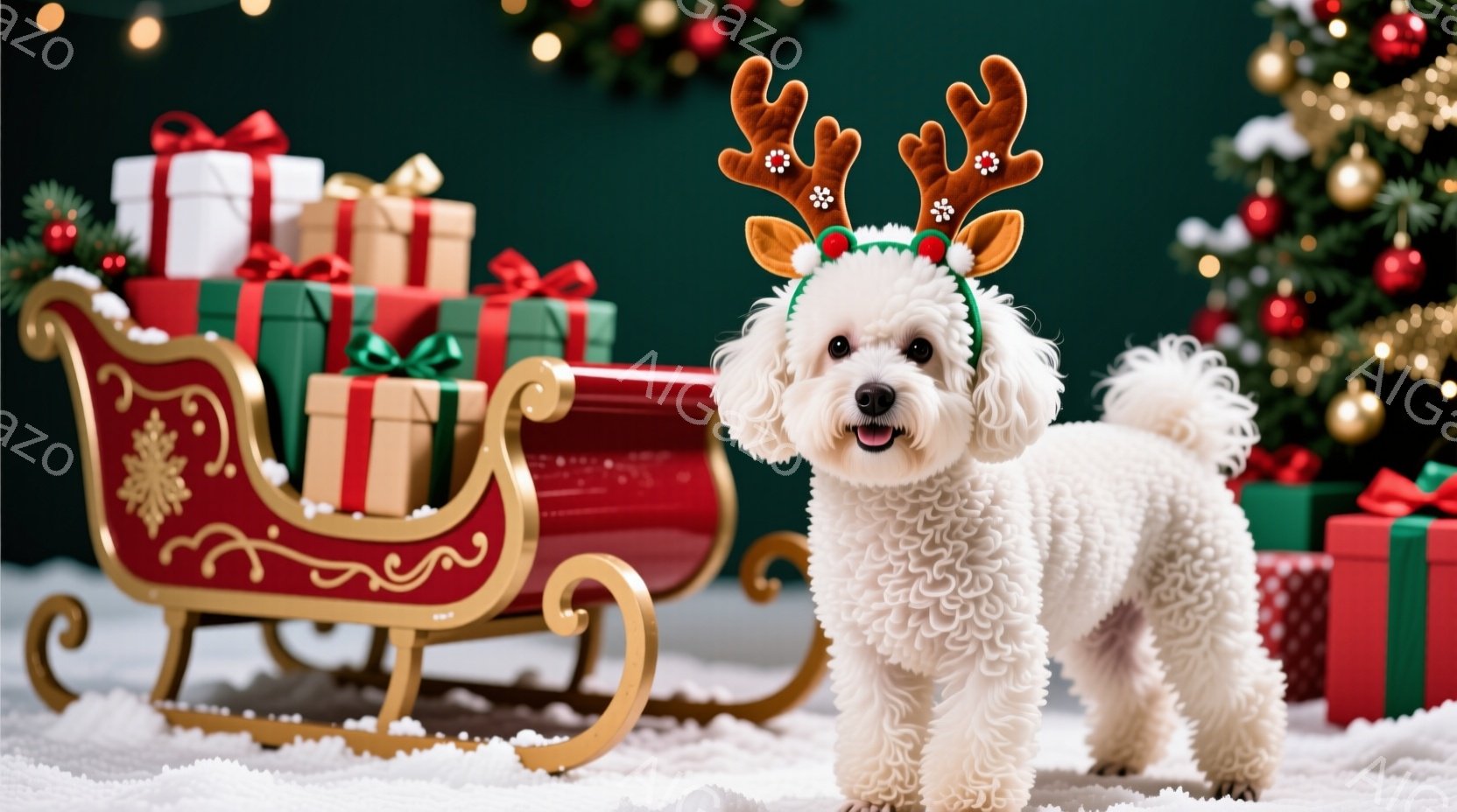 白い巻き毛の犬が、トナカイの角の飾りと緑色の蝶ネクタイをつけて、雪の上に立っている。背景には、赤いそりやカラフルなプレゼントボックス、そして装飾されたクリスマスツリーがあり、全体的に温かく、お祝いムードに満ちた雰囲気が漂っている。犬は正面を向き、楽しそうな表情でこちらを見ている。