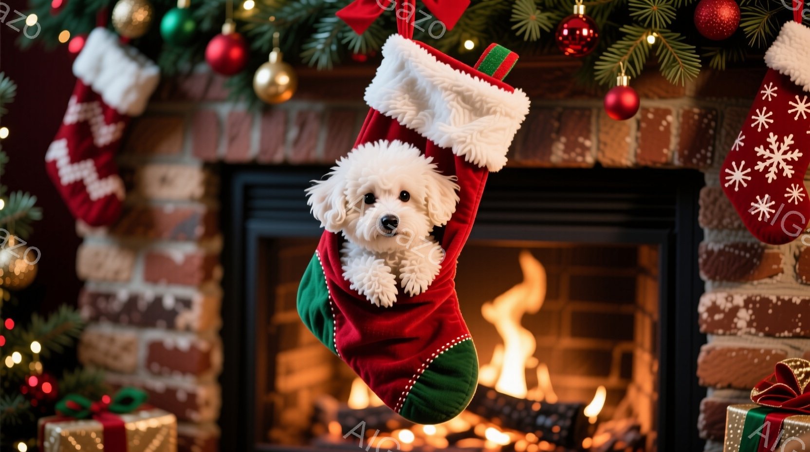 白い巻き毛の犬が、赤いクリスマスストッキングの中にちょこんと座っています。暖炉の火が灯っており、背景にはクリスマスオーナメントが飾られ、温かく幸せなクリスマスの雰囲気が漂っています。犬は少し不安そうに見えますが、可愛らしい表情で見る人の心を掴みます。