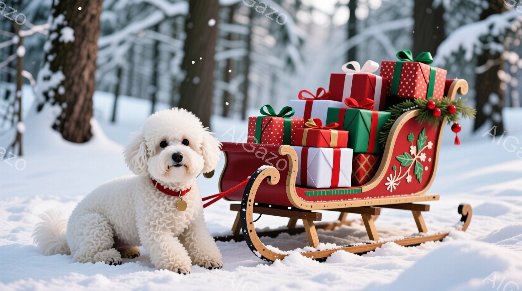 白い巻き毛の犬が雪の上に横たわり、赤いそりが隣にあります。そりには様々な色と柄のラッピングされたプレゼントが積み重ねられています。背景は雪で覆われた木々があり、冬の静かで暖かい雰囲気を醸し出しています。