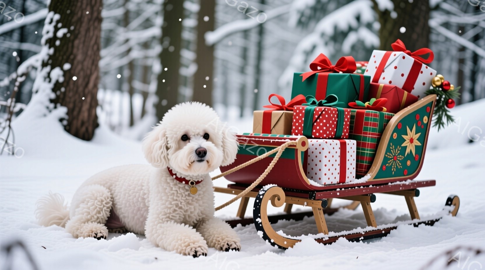 白い巻き毛の犬が雪の上に座り、赤い首輪をつけています。その隣には、緑、赤、金色の包装紙で飾られたプレゼントがたくさん積まれた、伝統的な赤いそりが置かれています。背景には雪景色が広がり、木々が立ち並び、クリスマスの温かく穏やかな雰囲気を醸し出しています。