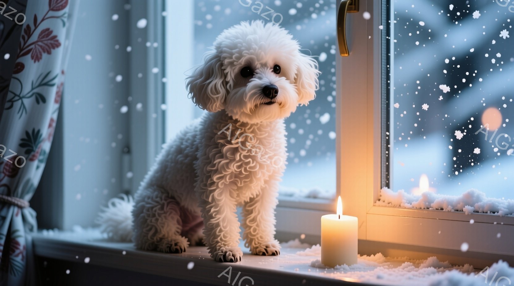白いビション・フリーゼが雪の降る窓辺に座っています。窓枠には雪が積もり、暖かく光るキャンドルが置かれています。外は雪景色で、穏やかで冬の雰囲気を感じさせます。