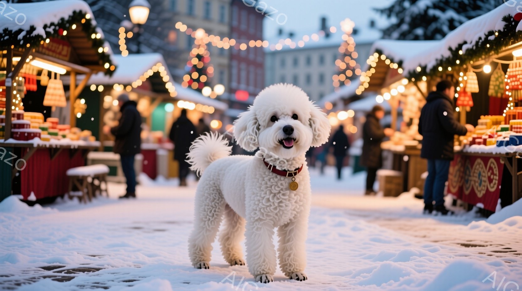 白い巻き毛の犬が雪の上に立っており、赤い首輪をしています。背景には、クリスマスマーケットのような賑やかな雰囲気があり、屋台が並び、キラキラと輝くイルミネーションが飾られています。雪が降っており、全体的に暖かく、お祭り気分を味わえる冬の風景です。