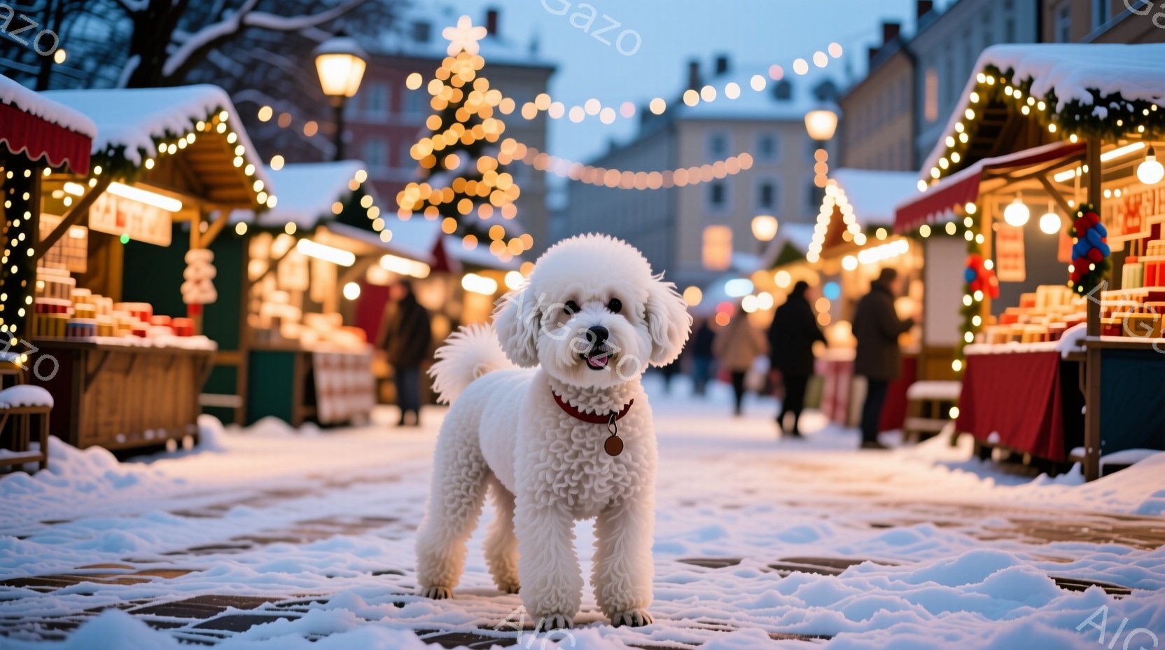 白い巻き毛のトイプードルが雪の降る祭りの通りで正面を向いて立っている。赤い首輪と金色のタグをつけており、毛並みがふわふわとしていて可愛らしい。背景には、クリスマスの飾り付けがされた屋台が並び、ぼんやりとした光の中で温かく華やかな雰囲気が漂っている。