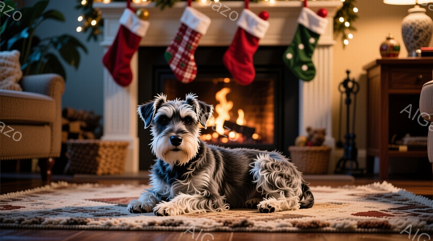 暖炉の前で、塩コショウのような毛並みを持つミニチュアシュナウザーがリラックスして横たわっています。クリスマスの装飾が施された暖炉と、カラフルなラグが暖かく居心地の良い雰囲気を醸し出しています。背景には、クリスマスストッキングが飾られた暖炉があり、部屋全体がホリデーシーズンにぴったりの、温かく魅力的な空間となっています。