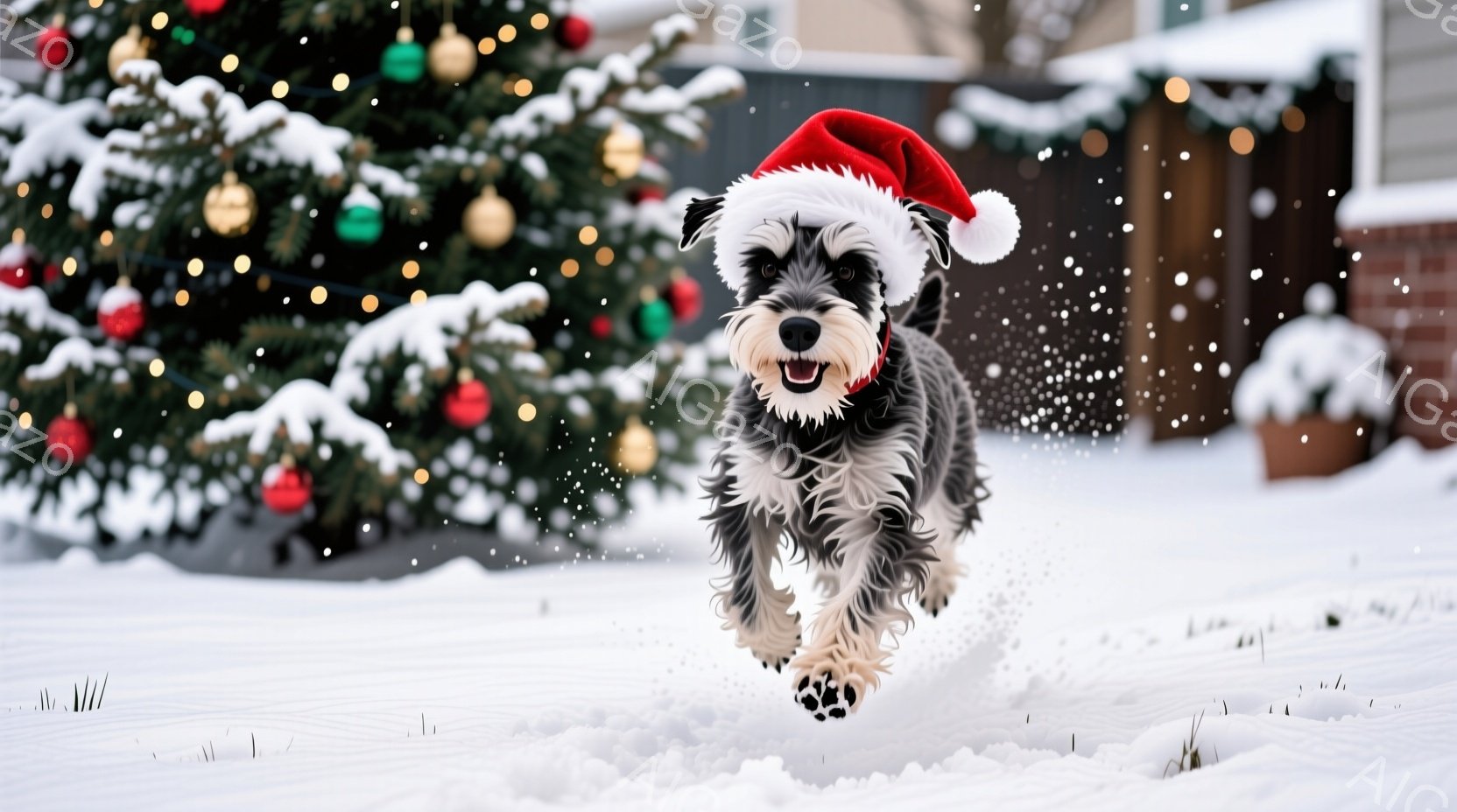 雪景色の中で、サンタの帽子を被ったテリア犬が勢いよく走っている。犬は口を開けて笑顔を見せ、楽しそうに雪の中を駆け抜けている。背景にはクリスマスツリーが飾られ、雪の降る冬の暖かい祝祭の雰囲気が漂っている。