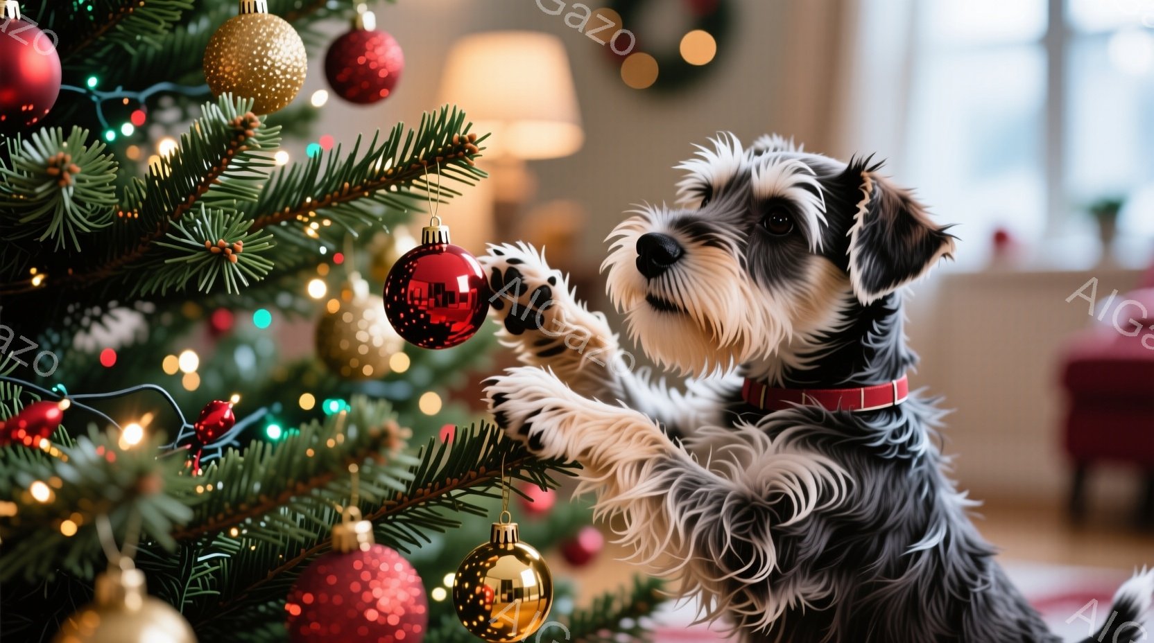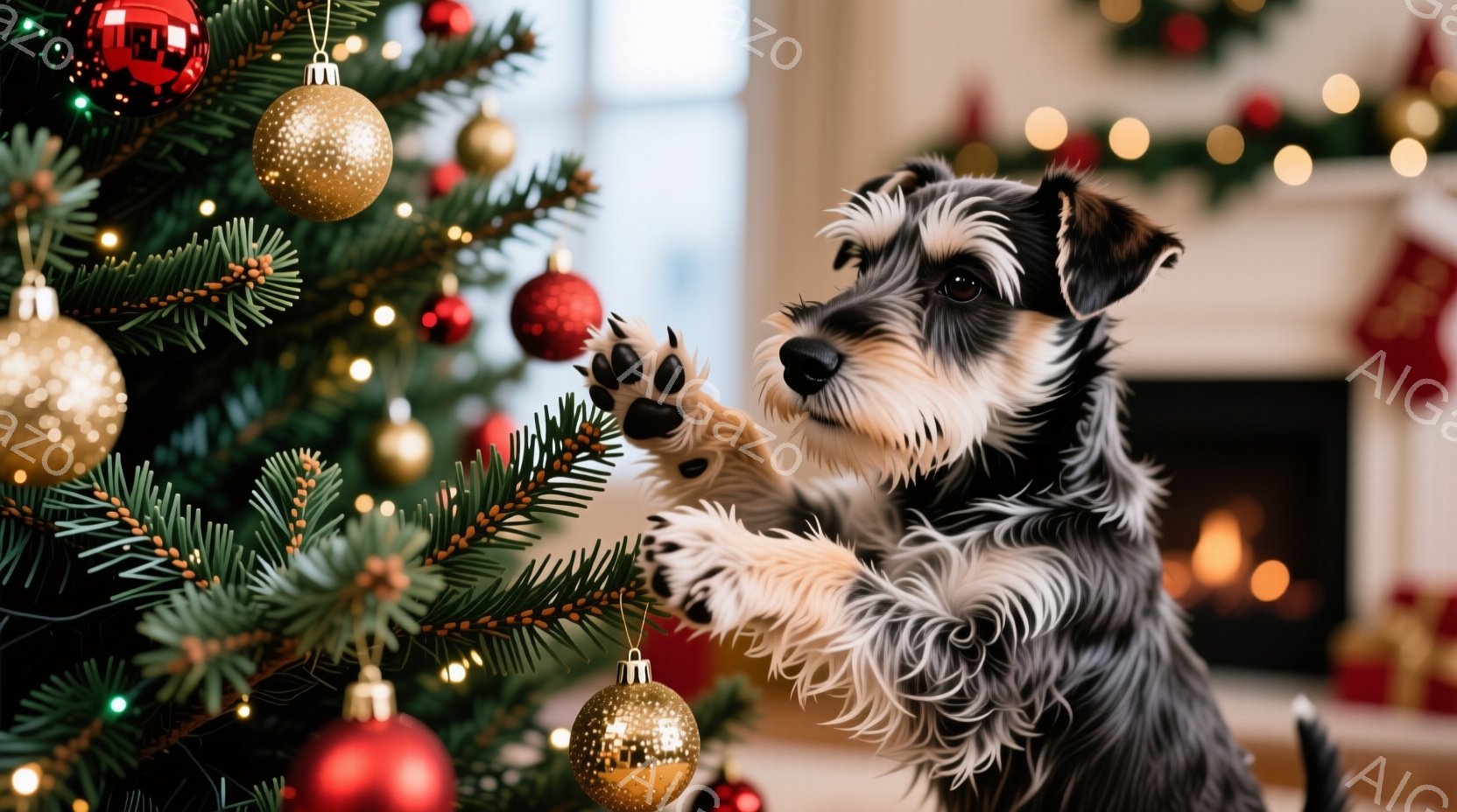 黒い毛並みのテリア犬がクリスマスツリーに手を伸ばし、赤いオーナメントに興味津々で注目しています。ツリーは多くの金色のオーナメントと赤いボールで飾られ、暖かく輝く光で満たされています。背景には暖炉が見え、ホリデーシーズンらしい居心地の良い雰囲気が漂っています。