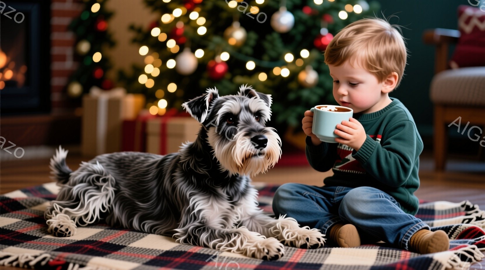 少年は赤いチェックのシャツにジーンズ姿で、床に座って赤いマグカップを両手で抱えています。彼の隣には、灰色の毛並みのミニチュアシュナウザーがリラックスして横たわっており、暖炉とクリスマスツリーが背景に見えます。全体的に暖かく、家庭的なクリスマスの雰囲気が漂っています。