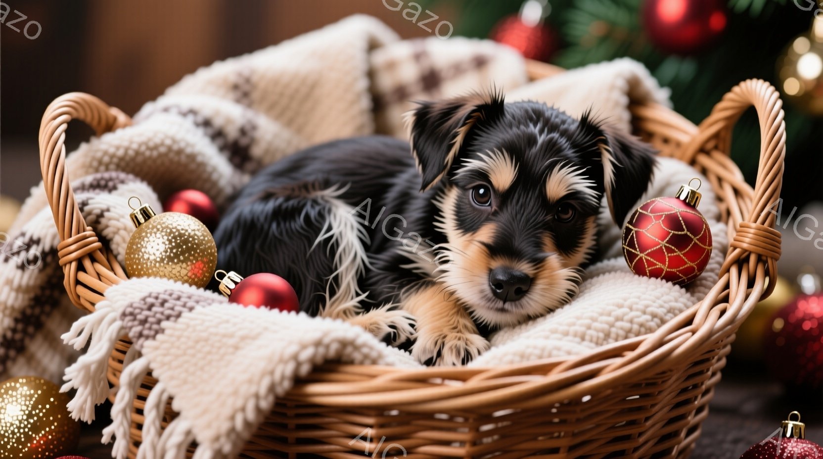 籐製のバスケットにふわふわの毛布が敷かれ、その中に小さなテリア犬が丸まって眠っています。犬は暗い毛並みに明るい茶色のアクセントがあり、優しい表情でカメラを見つめています。背景には、クリスマスオーナメントが散りばめられ、温かく、お祝いの雰囲気を作り出しています。