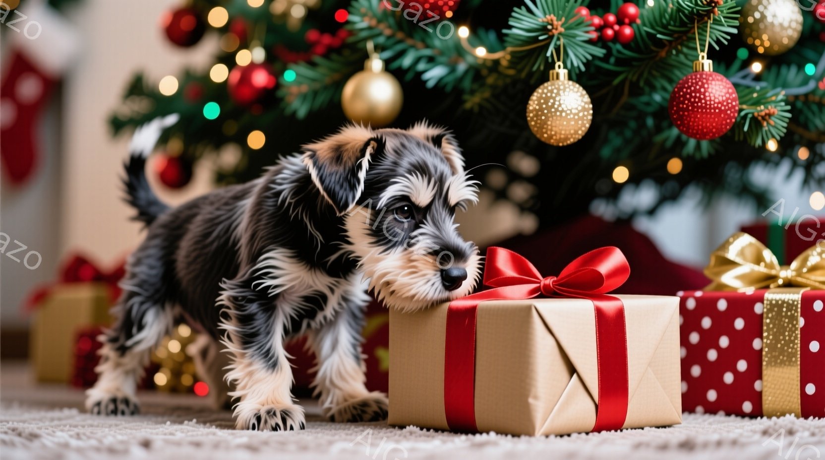 雪の降る冬の窓辺に、テリア系の犬が寄り添うように座っている。赤い首輪をつけ、外を眺めており、表情は穏やかで少し物憂げだ。背景には、ぼやけたクリスマスツリーの光が輝き、雪景色が広がっており、温かく、静かな冬の雰囲気が漂っている。