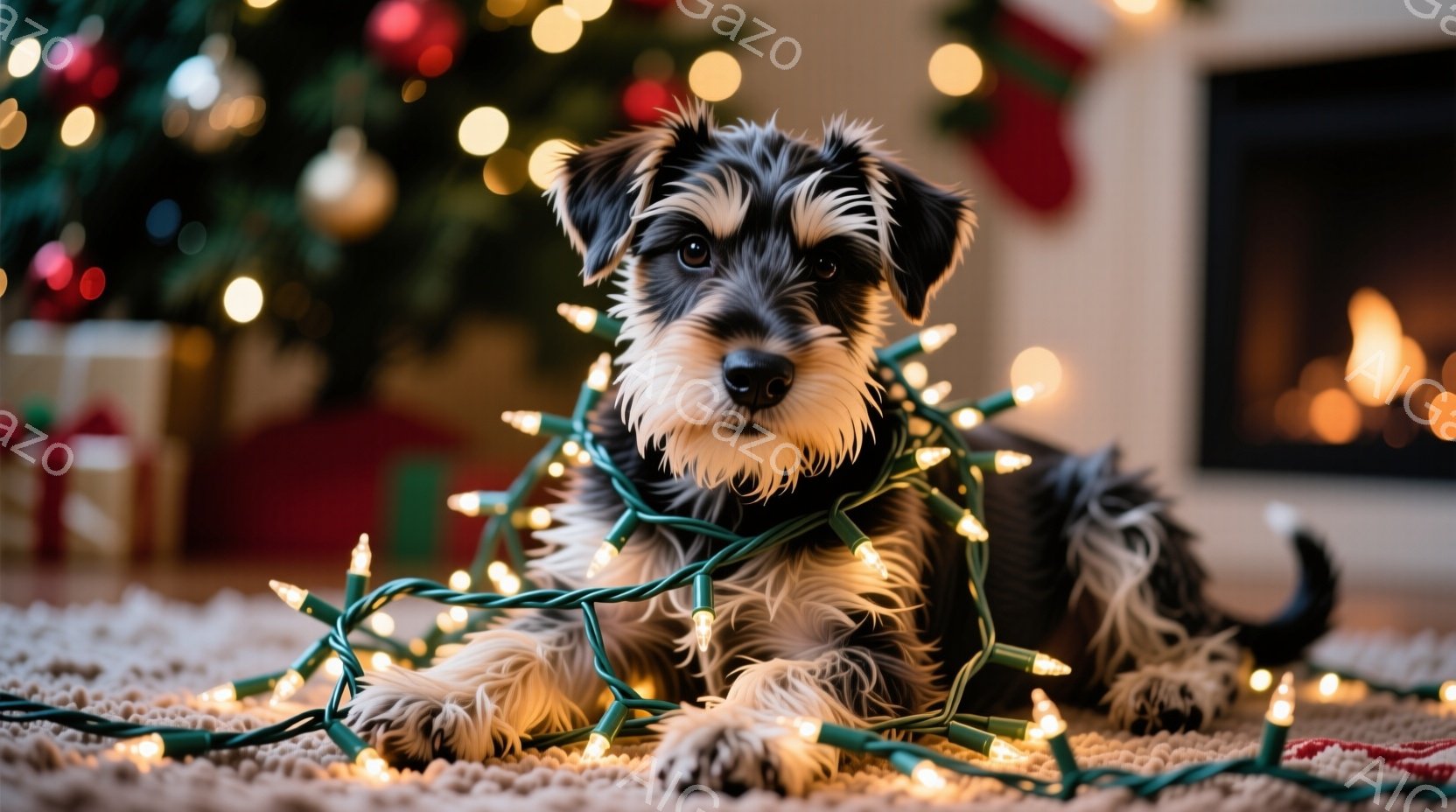 暖炉のそばのラグの上に、クリスマスツリーのイルミネーションに絡まった小さなテリア犬が横たわっています。犬は黒と白の毛並みで、穏やかな表情を浮かべ、リラックスした様子でイルミネーションに包まれています。背景には、プレゼントやクリスマスツリー、暖炉の火が見え、全体的に暖かく、お祝いムードに満ちた雰囲気です。