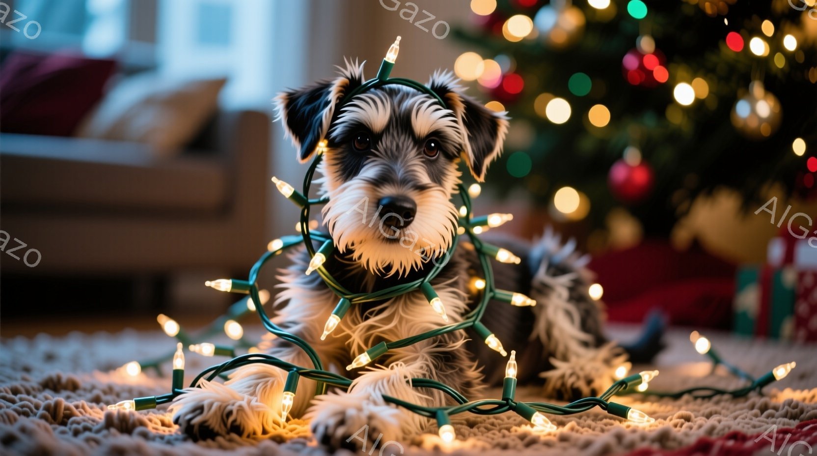 黒い毛並みを持つミニチュアシュナウザーが、クリスマスツリーのイルミネーションライトに絡まって横たわっています。犬はリラックスした表情で、少し口を開けて微笑んでいるように見えます。背景には、暖炉とぼんやりとしたクリスマスツリーが見え、温かく居心地の良い休日の雰囲気を醸し出しています。