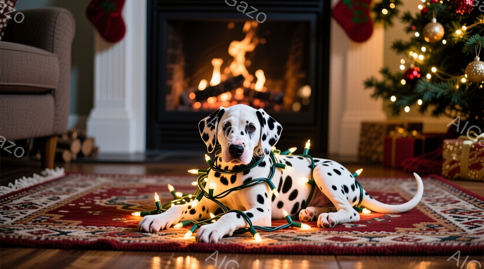 ダルメシアンの子犬が、赤い模様の絨毯の上で、クリスマスツリーのイルミネーションライトに絡まっています。暖炉の火が背景にあり、暖かい雰囲気を醸し出しています。部屋全体がクリスマスの装飾で飾られ、穏やかで幸せな雰囲気が漂っています。