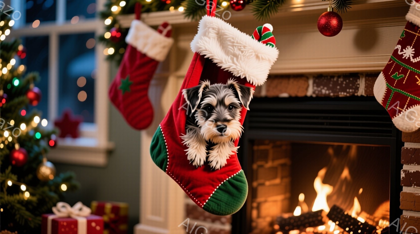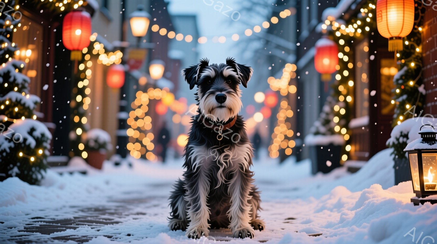 灰色の毛並みを持つ小型犬が雪に覆われた石畳の道に座っています。犬は赤い首輪を付けており、正面を見て穏やかな表情を浮かべています。背景には、イルミネーションで飾られた通りが広がり、雪が舞い散る冬の夜の温かく幻想的な雰囲気を醸し出しています。