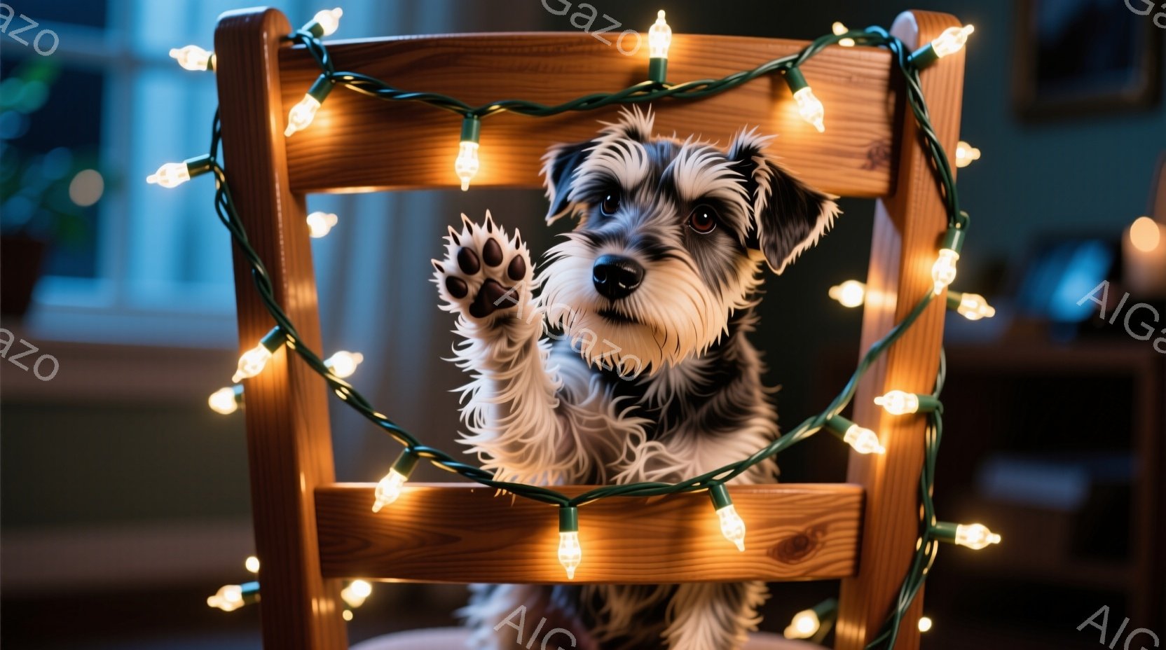 小さなテリア犬が木製の椅子の背もたれに前足をかけてぶら下がっています。犬は黒と白の毛並みで、つぶらな瞳で見つめており、愛らしい表情をしています。背景には植物が見え、暖かい色のクリスマスライトが犬を囲み、穏やかで心地よい雰囲気を醸し出しています。