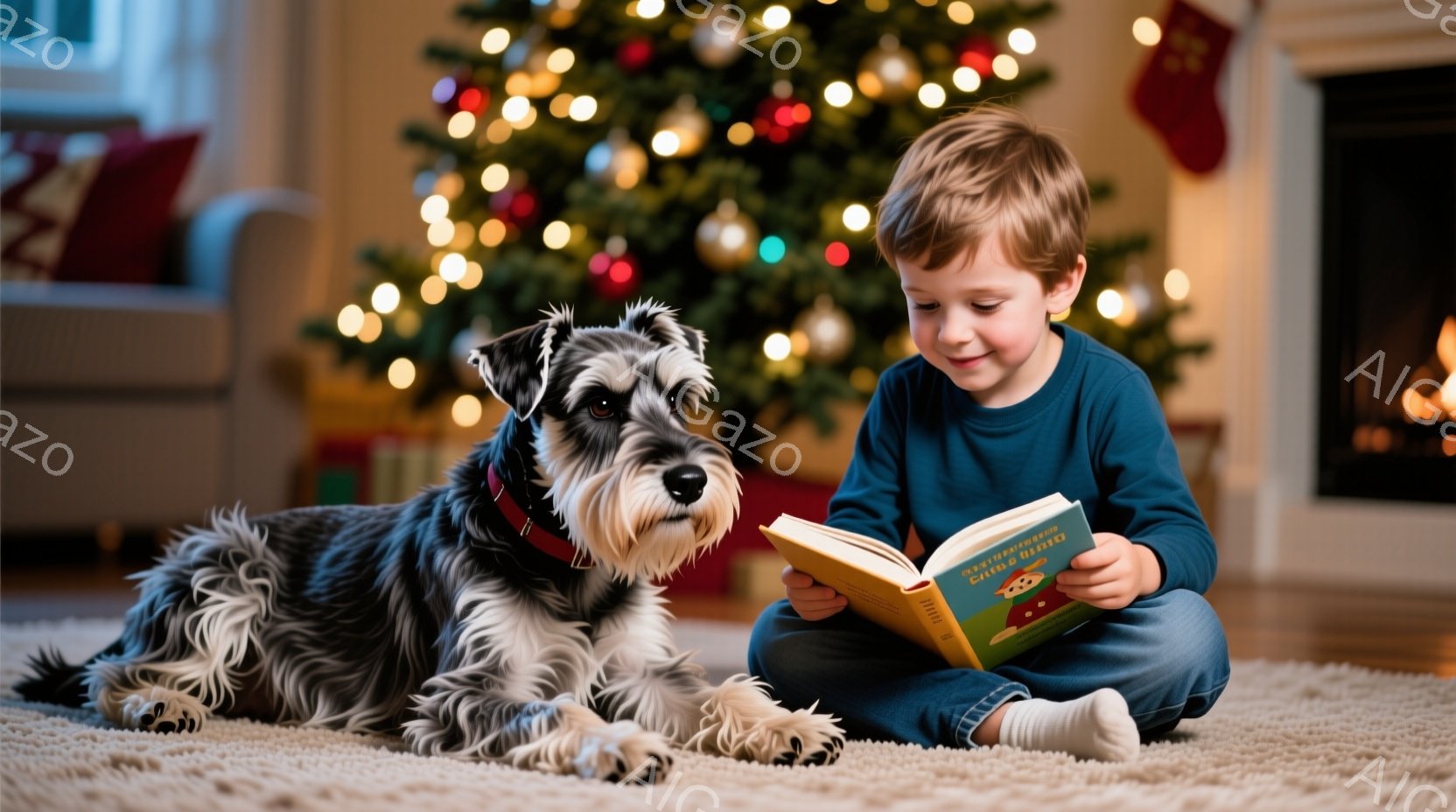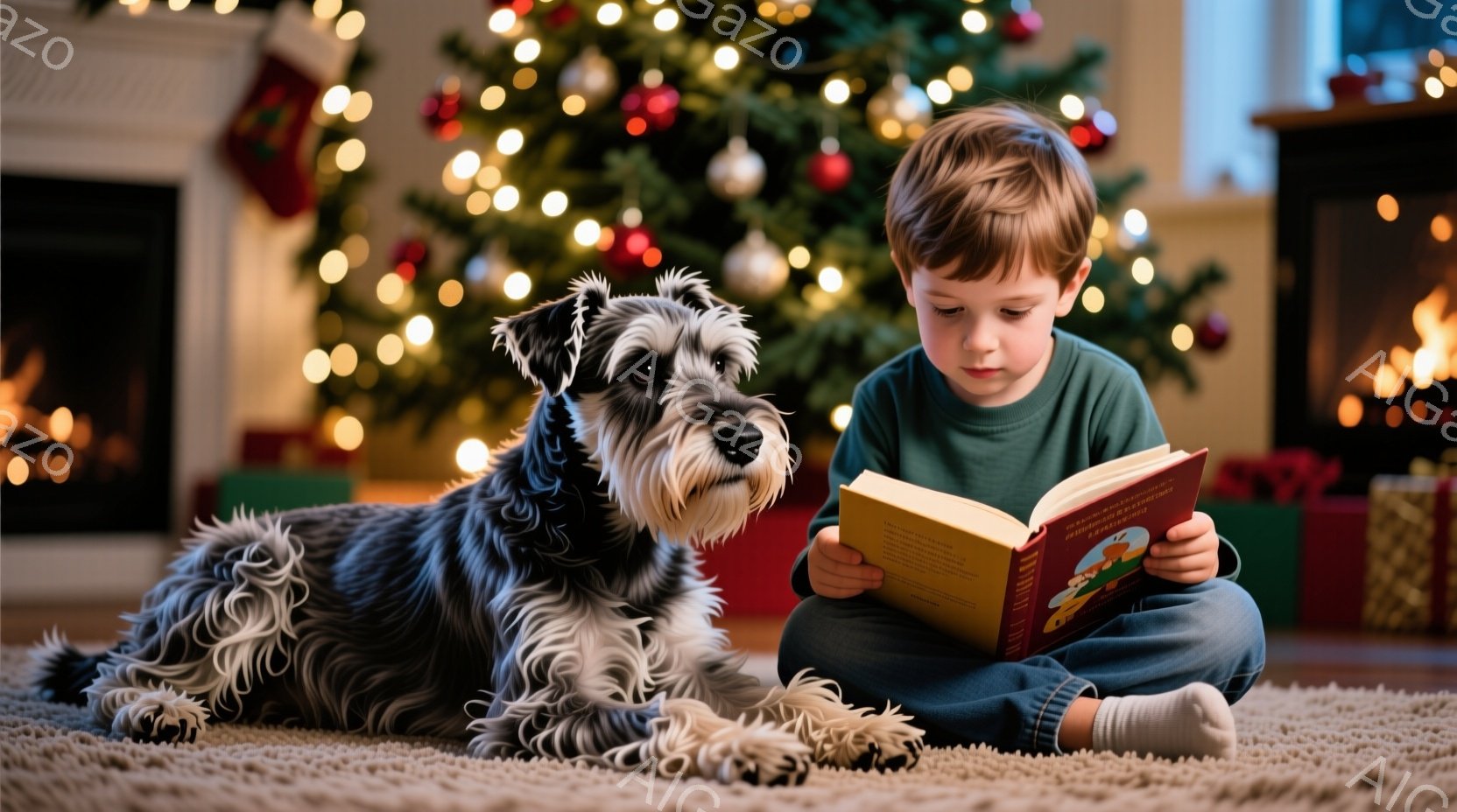 少年は緑色の長袖シャツに茶色のズボンを履き、床に座って本を読んでいます。彼の横には、灰色のテリア犬が寄り添い、赤い首輪をつけてリラックスした様子です。背景には、飾り付けられたクリスマスツリーやプレゼントボックスがあり、暖かくお祝いムードに満ちた室内が描かれています。