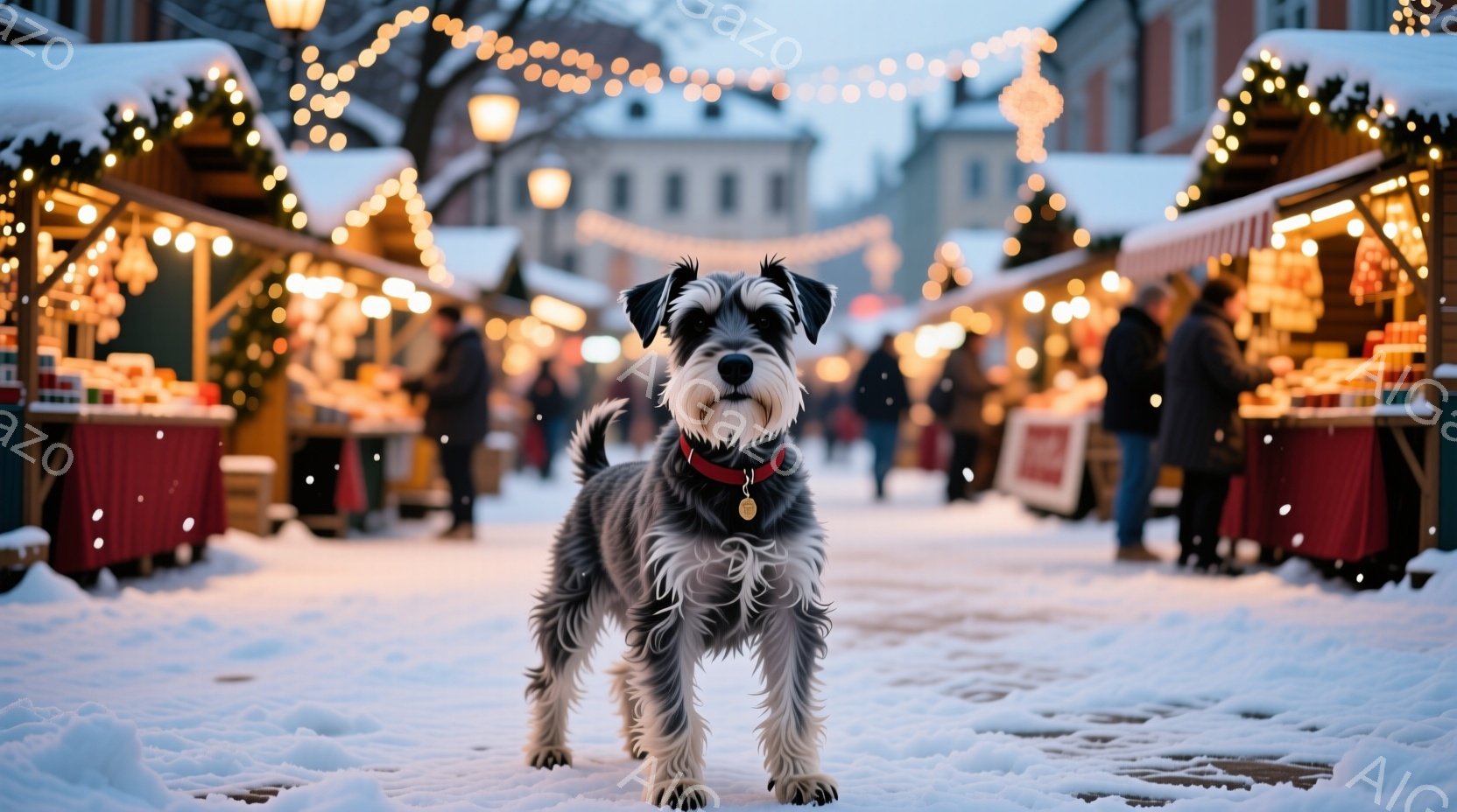 雪が降る市場の真ん中に、テリア犬が立っている。犬は灰色の毛並みで、赤い首輪をつけており、まっすぐ前を見て少し警戒した表情をしている。背景には、クリスマスマーケットのような屋台が並び、多くの人が歩き、温かい光が灯っている。