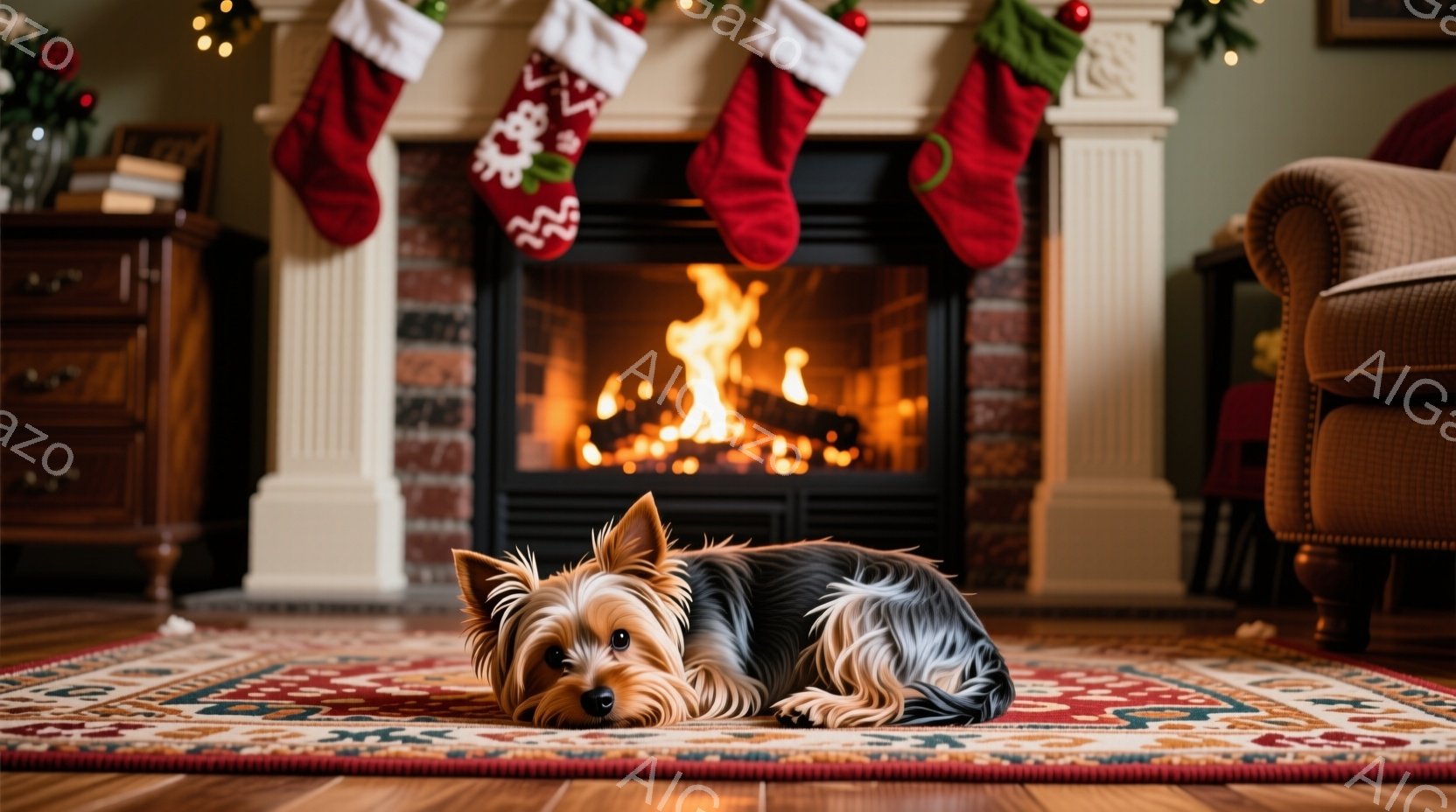 暖炉の前でヨークシャーテリアが床の絨毯に横たわっている。背景には、クリスマスソックスが飾られた暖炉と、木製の家具が見える。全体的に暖かく、穏やかなクリスマスの雰囲気が漂っている。