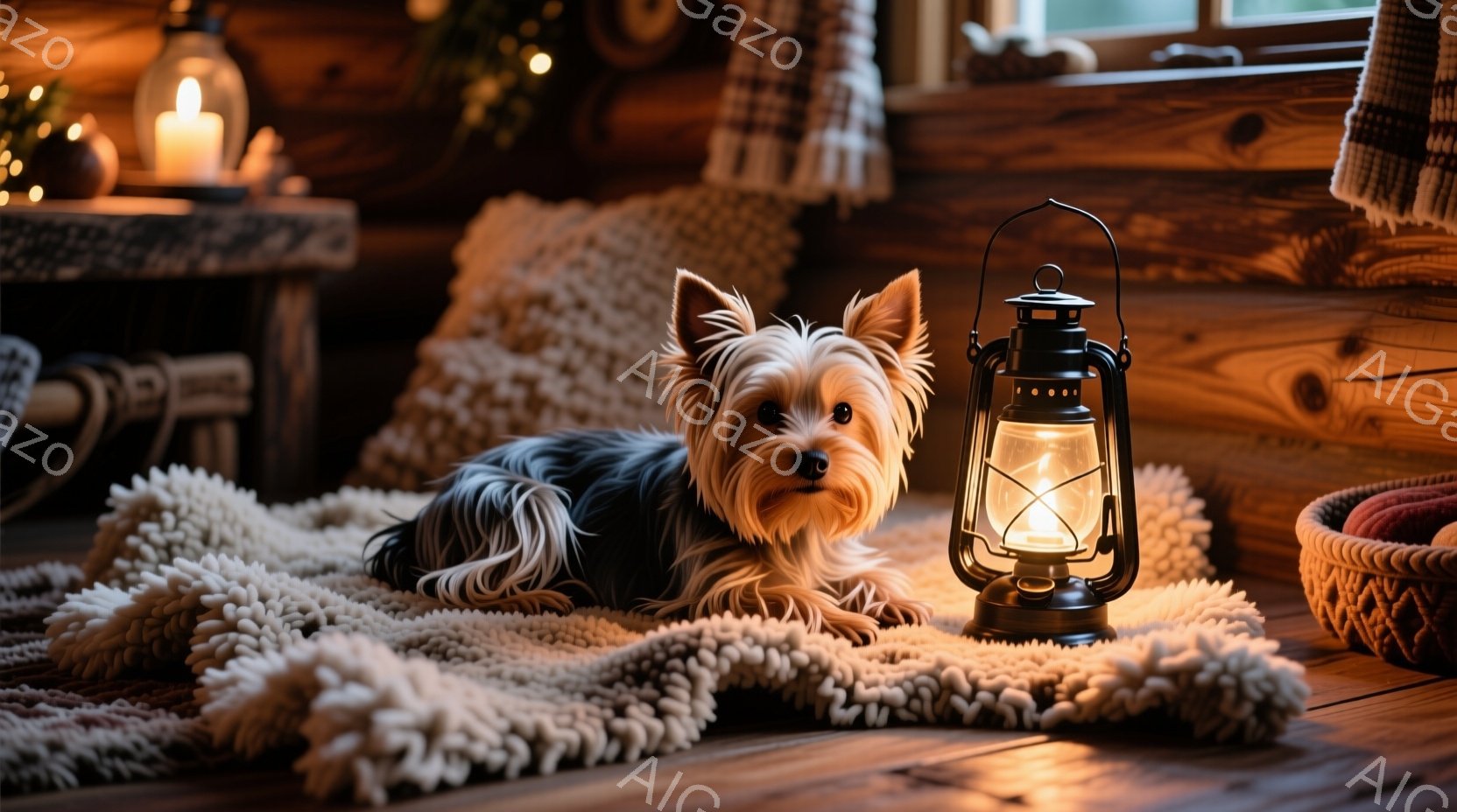 長い毛並みを持つヨークシャーテリアが、ふわふわの白いラグの上に横たわっています。近くには灯油ランプが置かれ、暖かく優しい光を灯しています。背景は木の壁で、素朴で落ち着いた雰囲気の室内空間です。