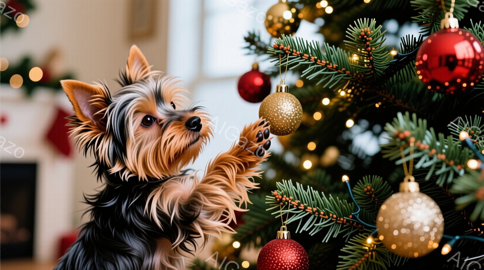 クリスマスツリーの枝に小さな犬が前足を伸ばして触れようとしています。犬はヨークシャーテリアで、ふわふわの毛並みと好奇心に満ちた表情が特徴的です。背景にはぼやけたクリスマス装飾が見え、温かく幸せな雰囲気が漂っています。