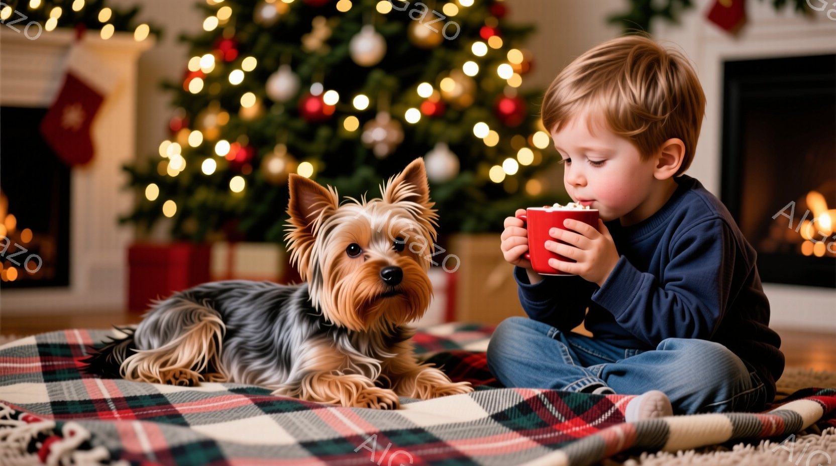 小さなヨークシャーテリアが、白いフリンジのついた毛布に包まれて、籐のバスケットの中に丸まって眠っています。背景には、木製の床と、赤と金のオーナメントが散りばめられたクリスマスツリーの一部が見えます。温かみのある光と、毛布の柔らかい質感により、安らかで居心地の良い雰囲気が漂っています。
