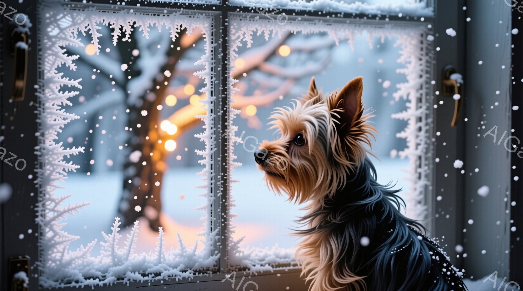 窓辺にヨークシャーテリアが座り、外の雪景色を物憂げに見つめている。その毛並みは丁寧に手入れされ、暖かな茶色と黒のコントラストが美しい。背景には雪に覆われた木々とぼんやりとした光が灯る建物があり、静かで穏やかな冬の雰囲気を醸し出している。