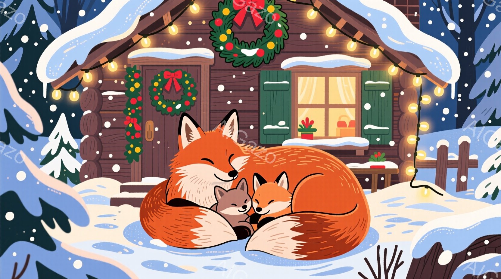 雪が舞う冬の風景の中に、親キツネと子キツネが寄り添って眠っています。木造の家にはクリスマスリースが飾られ、窓から温かい光が漏れ、雪景色と相まって穏やかで温かい雰囲気を醸し出しています。背景には雪に覆われた木々とフェンスが見られ、冬の静寂と安らぎを感じさせます。