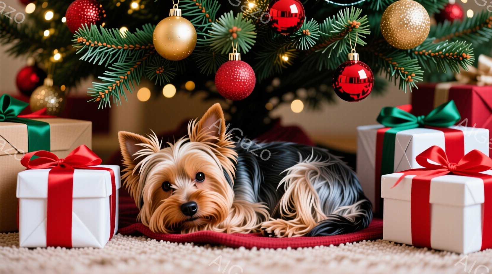 ヨークシャーテリアが赤い敷物の上に横たわり、周囲には様々な包装紙で飾られたクリスマスプレゼントが並んでいます。犬は落ち着いた表情でカメラを見つめており、背景にはクリスマスツリーの緑の枝と輝くオーナメントが見えます。全体的に温かく、お祝いムードに満ちたクリスマスの雰囲気が漂っています。