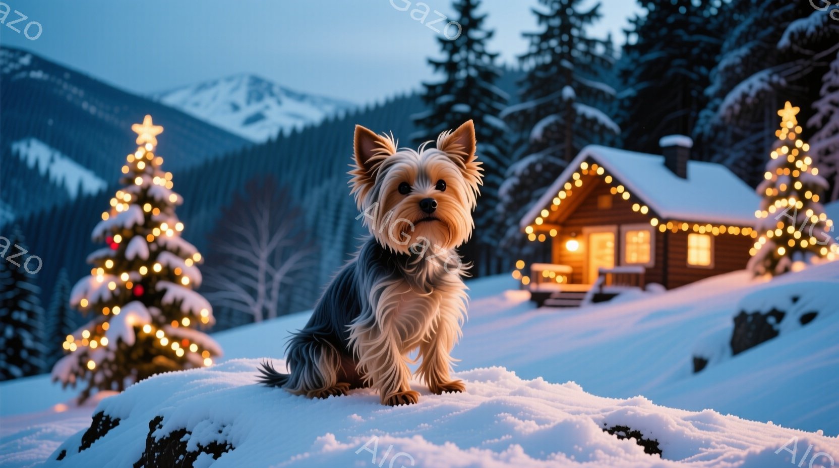 雪に覆われた丘の上に、ヨークシャーテリアが凛々と座っています。背景には、クリスマスイルミネーションで飾られた可愛らしい丸太小屋と、雪化粧した針葉樹の森林が広がっています。夕暮れ時の空と暖色の光が、温かく穏やかな冬の雰囲気を醸し出しています。