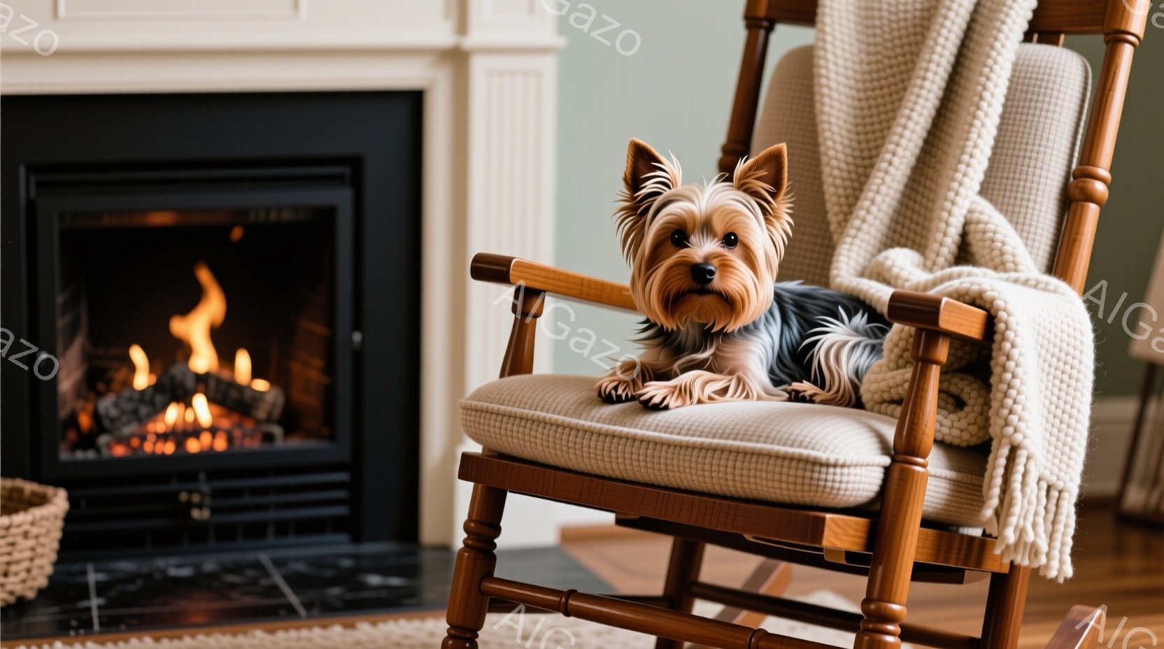 柔らかいクリーム色のロッキングチェアに、毛並みの美しいヨークシャーテリアが横たわっています。犬はリラックスした表情で、穏やかな眼差しでカメラを見ています。背景には暖炉があり、燃え盛る炎が温かく、居心地の良い雰囲気を醸し出しています。