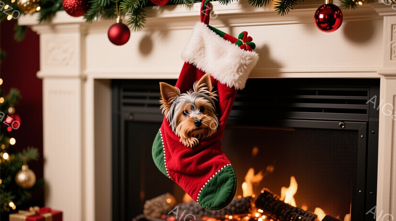 赤いクリスマスストッキングの中から、ヨークシャーテリアの子犬が顔を出しています。子犬は少し驚いたような表情で、好奇心旺盛な様子が伺えます。背景には暖炉とクリスマスツリーが見え、華やかで温かいクリスマスの雰囲気が漂っています。
