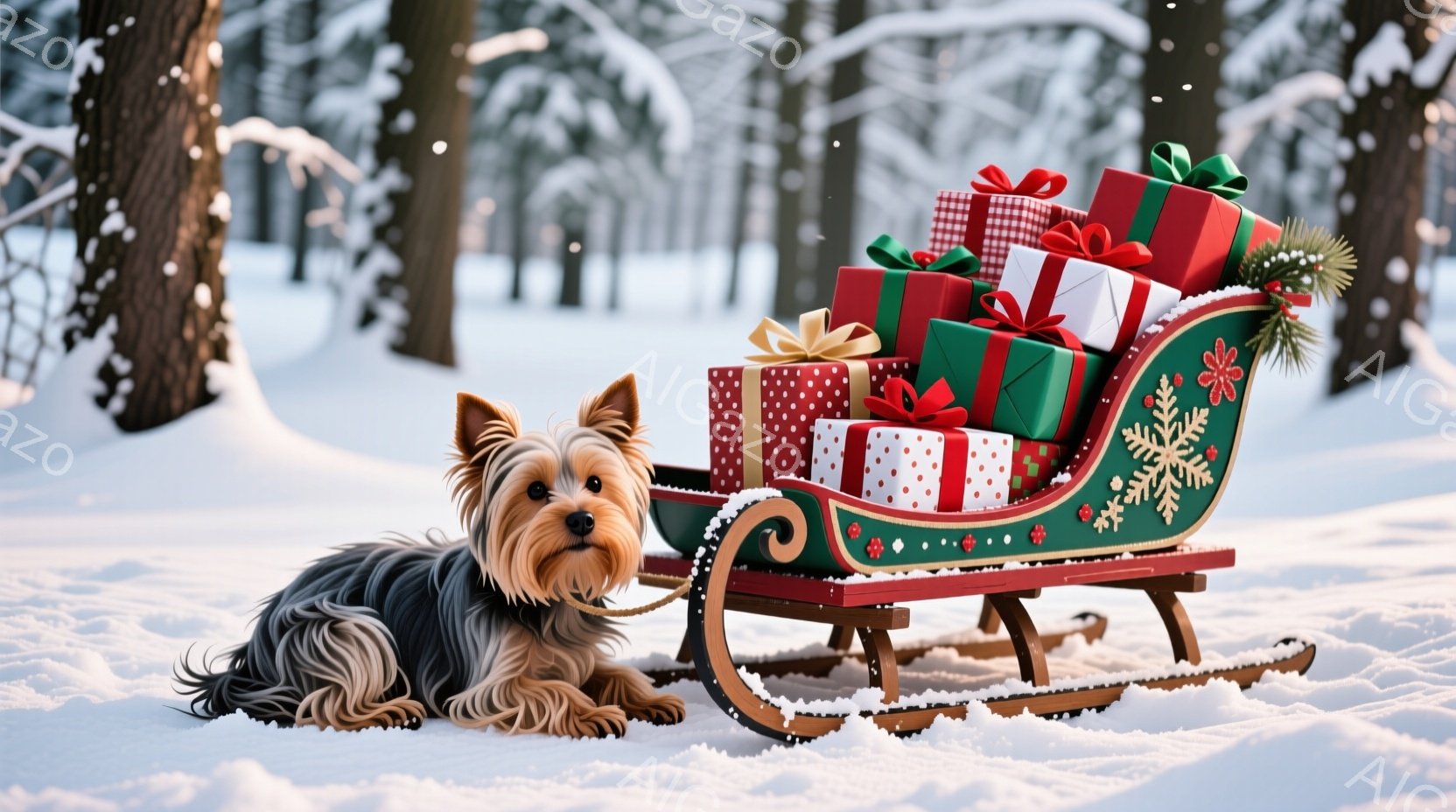 雪景色の中に、赤いそりにプレゼントの山が積まれ、その隣にはヨークシャーテリアが座っています。犬は毛並みの美しい茶色と黒の毛並みで、穏やかな表情をしています。背景は雪に覆われた木々で、クリスマスの温かく静かな雰囲気を醸し出しています。