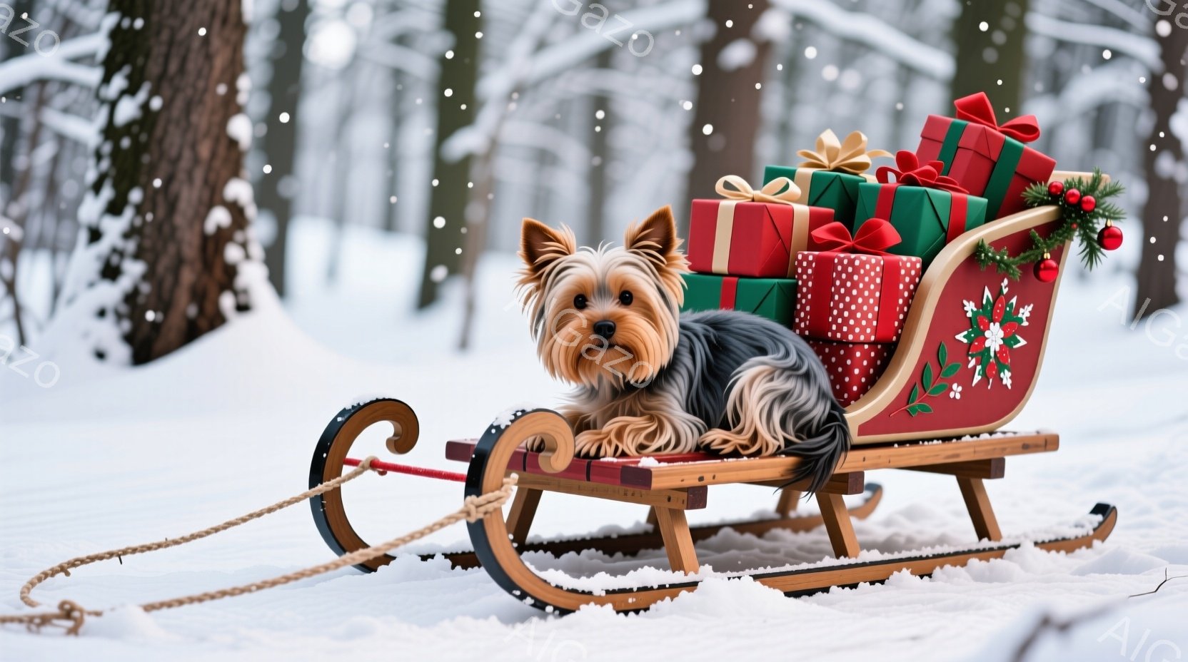雪景色の中に、小さなそりがプレゼントでいっぱいになっている写真です。ヨークシャーテリアがそりの横に座り、少し微笑んでいるような表情でこちらを見ている。背景には雪で覆われた木々がぼんやりと見え、クリスマスの穏やかで温かい雰囲気が漂っている。