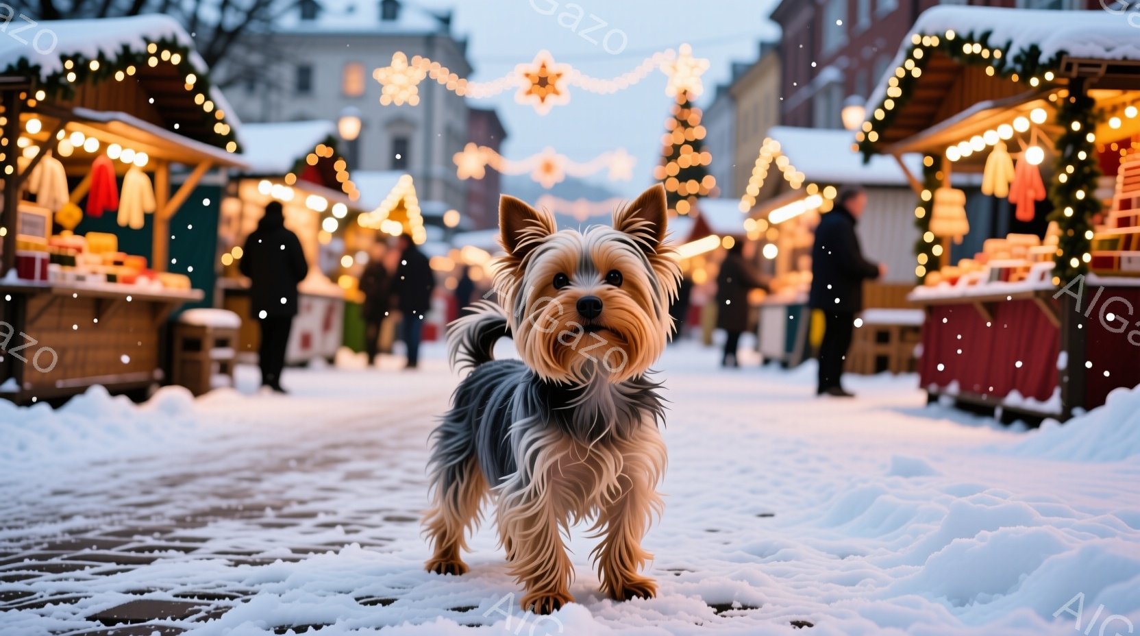 雪が降る賑やかな市場で、ヨークシャーテリアが正面を見据えて立っている。毛並みは茶色と黒で、ふさふさとしており、表情は穏やかでどこか自信に満ちている。背景には木造の屋台が並び、暖かい光が灯り、クリスマスの飾り付けが施されており、冬の暖かく楽しい雰囲気が漂っている。