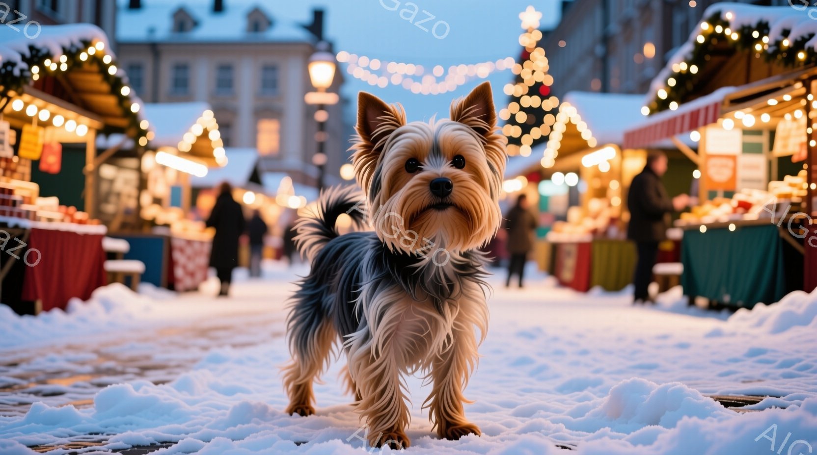 雪が降るクリスマスのマーケットを歩くヨークシャーテリアが写っています。犬は前足を少し上げて、カメラの方を見ており、毛並みが美しく、表情も穏やかです。背景には、ライトアップされた屋台や、ぼんやりと見える人々がおり、温かく幻想的な雰囲気が漂っています。