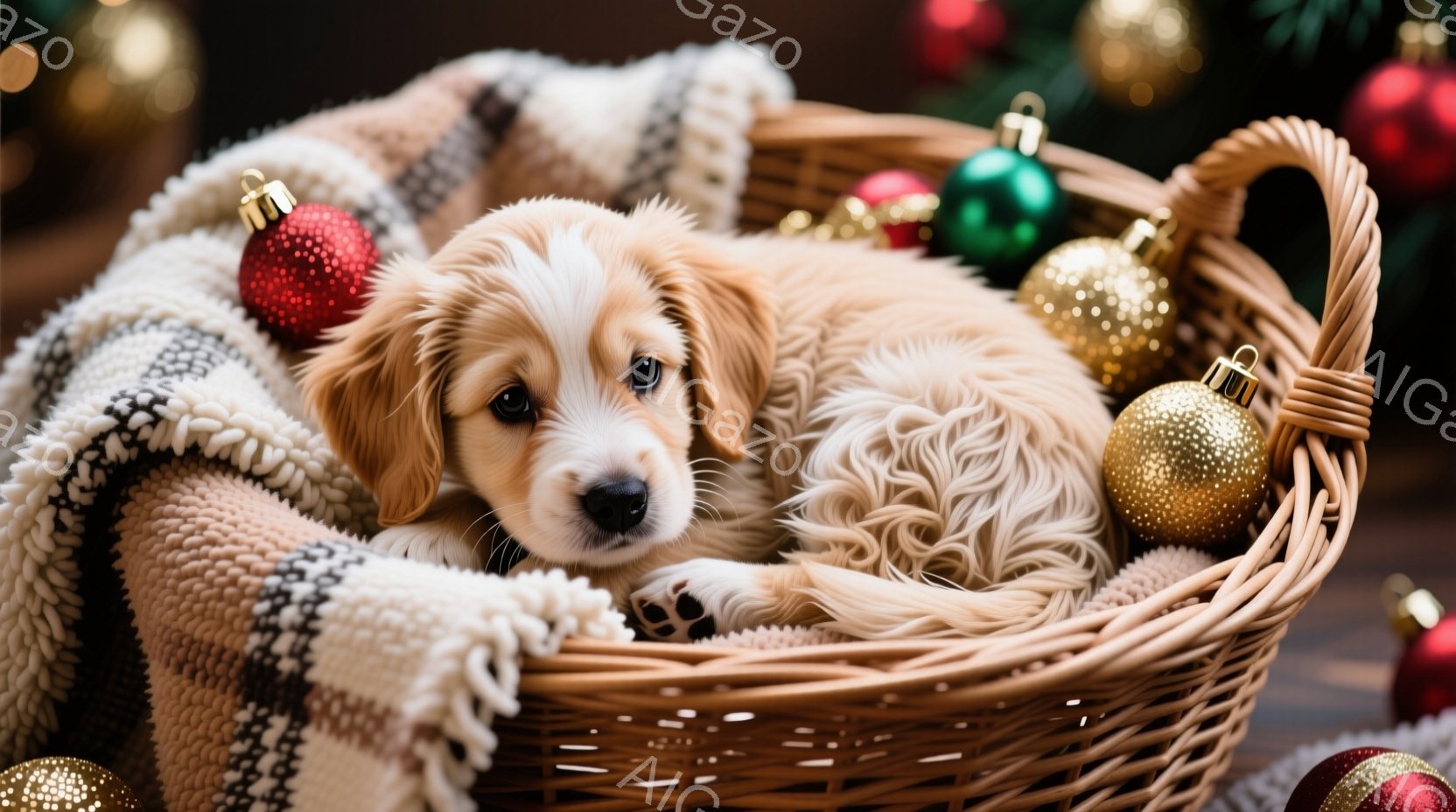 この無料AI生成画像「ふわふわのクリーム色の犬が、クリスマスツリーのイルミネーションライトに包まれて絨毯の上に座っています。その表情は少し困惑しているようで、しかし好奇心旺盛にも見えます。背景には、飾られたクリスマスツリーやプレゼント、暖炉の火が見え、温かく幸せなクリスマスの雰囲気が漂っています。」は、2025年10月24日に作成されました。 サイズは 1664×928px の高解像度で、商用利用も可能なフリー素材として提供しています。